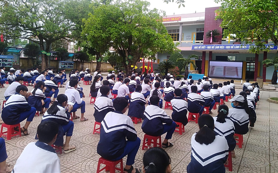 Last but not least, in 2021, the DMN Initiative successfully organized the Model of “Outdoor Classroom” using a Large LED Screen and portable speaker. Post-COVID Learning Space model is the result of a partnership between the DMN Initiative, Tran Hung Dao Secondary School in Cam Lo district and the Covid-19 Young Leaders Fund under One Young World. The model is deployed in the form of direct teaching and learning. In which, the students have to wear a mask and sit at a distance of 1.5 meters. Teachers will apply information technology through the use of Large LED Screen. The experiment for the model session was the students of Tran Hung Dao Secondary School under the pioneering teaching of teacher Nguyen Thi Kim Yen.